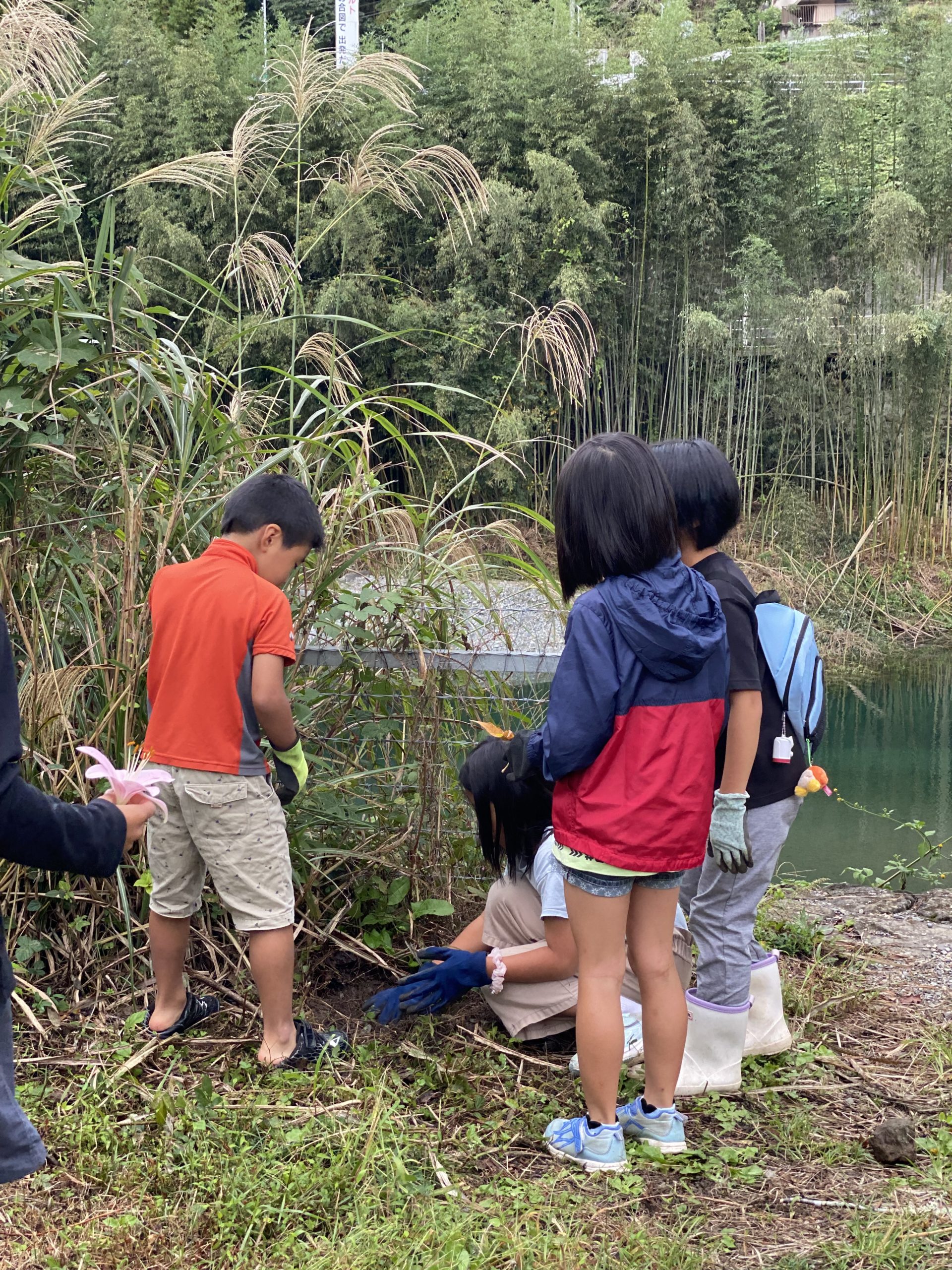 草をよけ、穴を掘り、季節の花をつみ