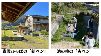 ・最近は草がぼうぼうに茂ってしまい、あまり人が近寄らなくなっている池周辺エリアだが、その横にあるベンチは「古ベン」という名前をつけて呼ぶくらい、子どもたちにとっては日常的に利用している場所だった。(「古ベン」は、古いベンチの略。おそらく「新ベン」は青雲ひろばにあるベンチのこと)
