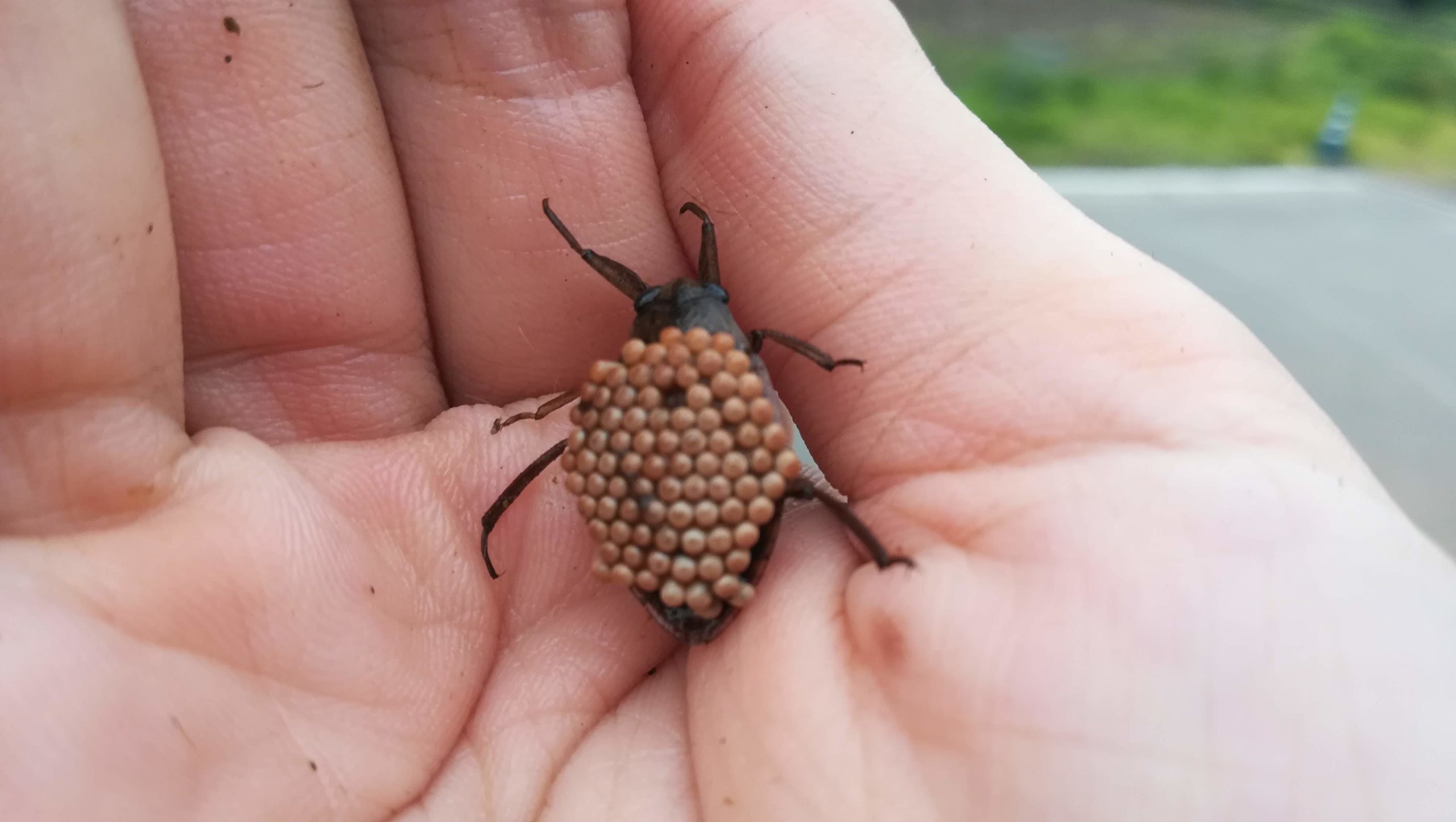 後から調べてみると「コオイムシ」といって、オスが卵を背負って育てているらしいです。イクメンですね!