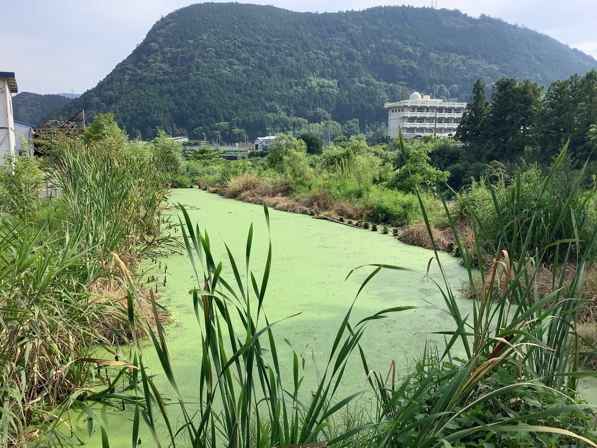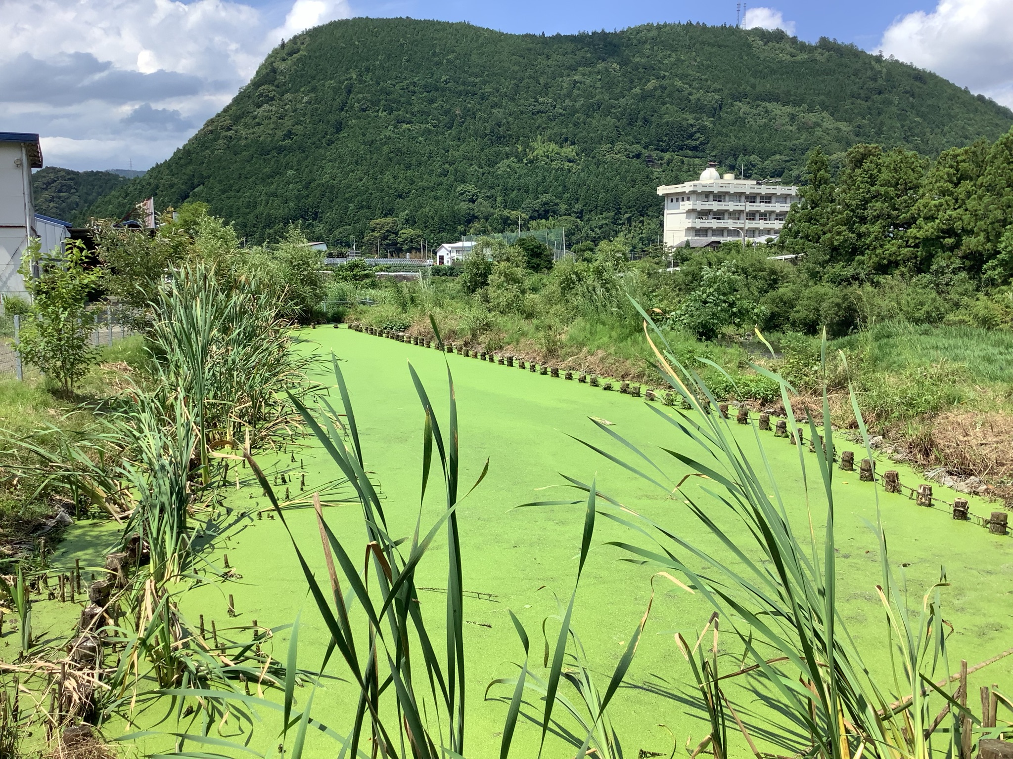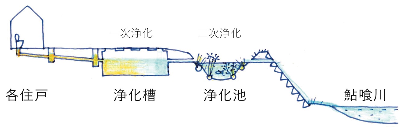 大埜地住宅と鮎喰川コモンで使った水は、まず合併浄化槽で処理されます。その処理だけでも法律的には十分に問題ない数値まできれいになるのですが、さらに水質浄化池を通すことで、余分な栄養を植物で吸い取ってもらった上で、鮎喰川に放出しようという仕組みです。