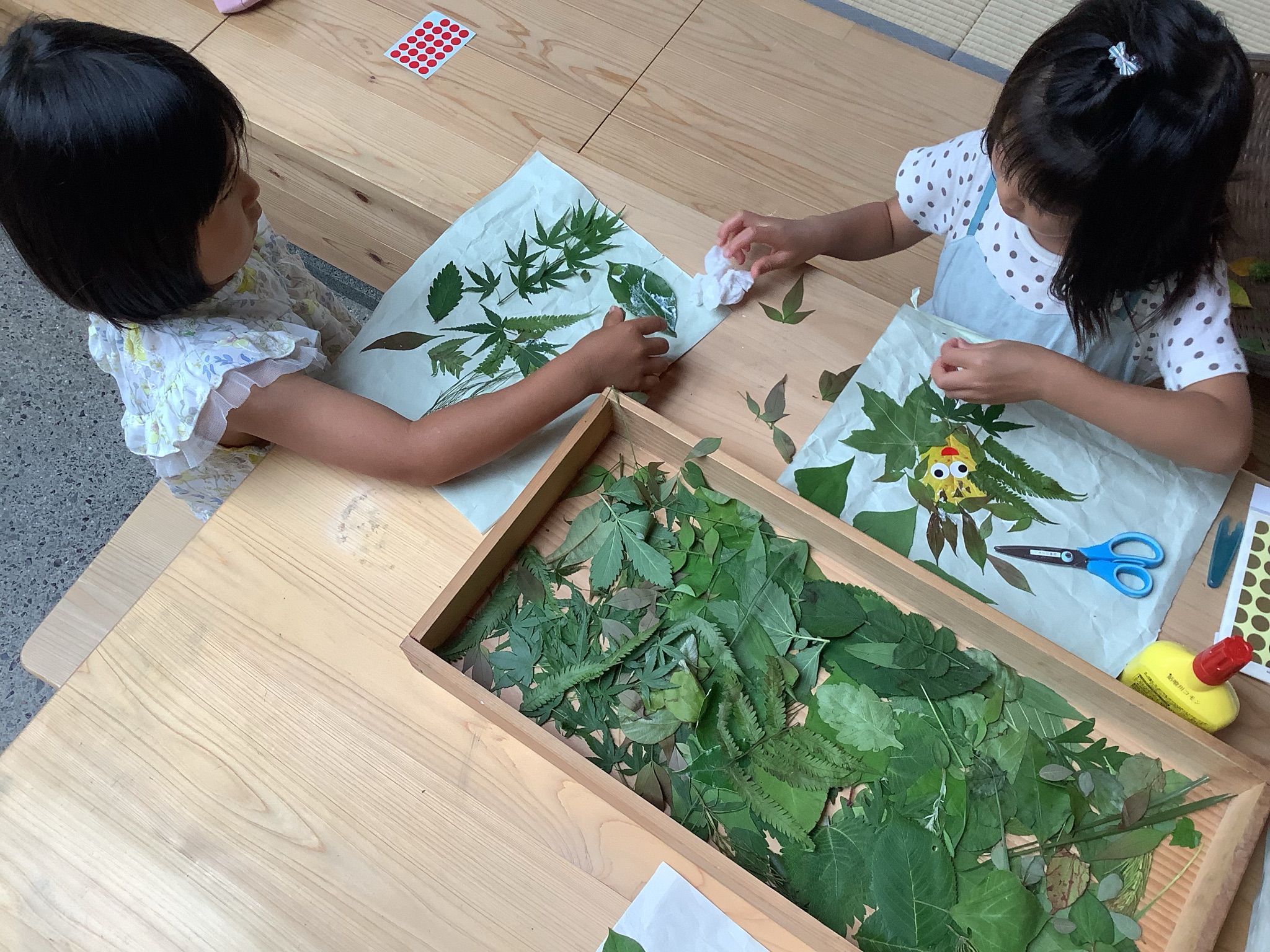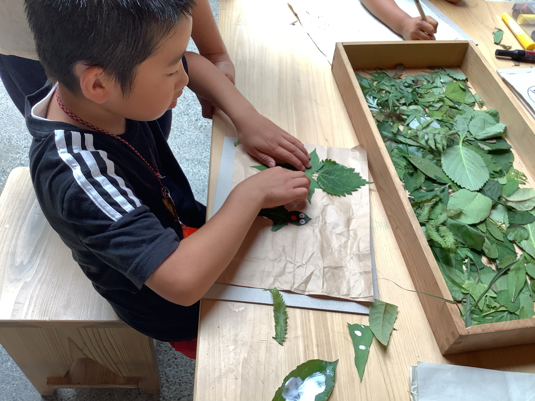 敷地内で集めてきたいろいろな形や色の葉っぱ。その中から気に入った葉っぱを組み合わせ、思い思いの形を作って紙に貼っていきます。