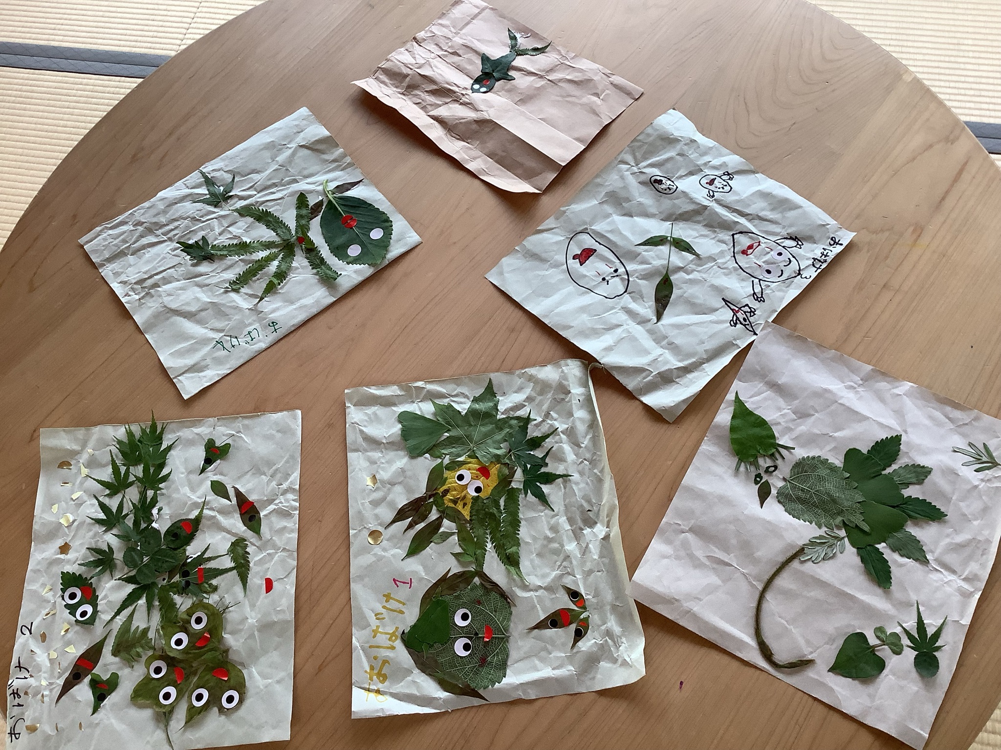 つくっているうちに、子どもたちのワクワクがどんどんふくらみ、最後には「葉っぱお化け」を主役とした紙芝居形式の作品も完成したようですよ!