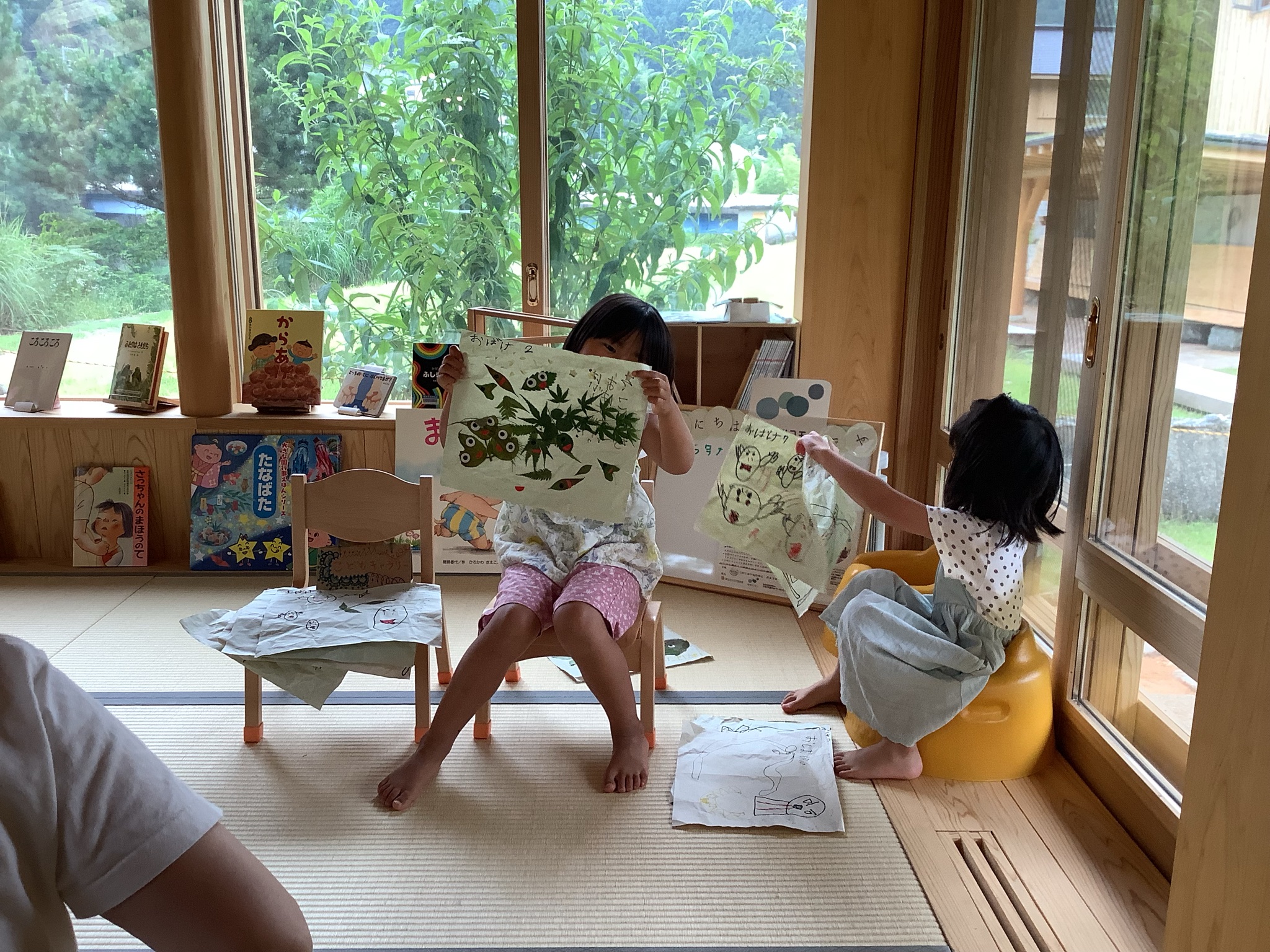大人たちが草とりに励んでいる間、子どもたちは、コモンスタッフのあやのさん・じゅんこさんと一緒に、葉っぱでお絵描きを楽しんでいたよう。