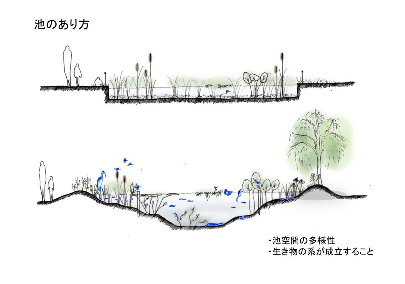 このように深さに変化があることで、水中に多様な環境があることから、様々な動植物が生息可能になり、池が1つの小さな生態系をつくりだすことを期待しています。様々な水生植物が池の中や際で成長する過程で、富栄養状態の水から窒素分を吸着することで、水質を浄化してくれます。とはいえ植物が枯れた後、水の中に倒れてしまうと、せっかく固定した窒素分がまた水の中に溶け込んでしまう。