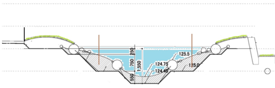 池の中はすり鉢状、3段階で深くなっていて、一番深いところの水深は約1.6m。(間違って人が池に落ちたりしないよう、池の外周にはフェンスを、さらに水中1段目の浅瀬に木杭+ロープを張っています)
