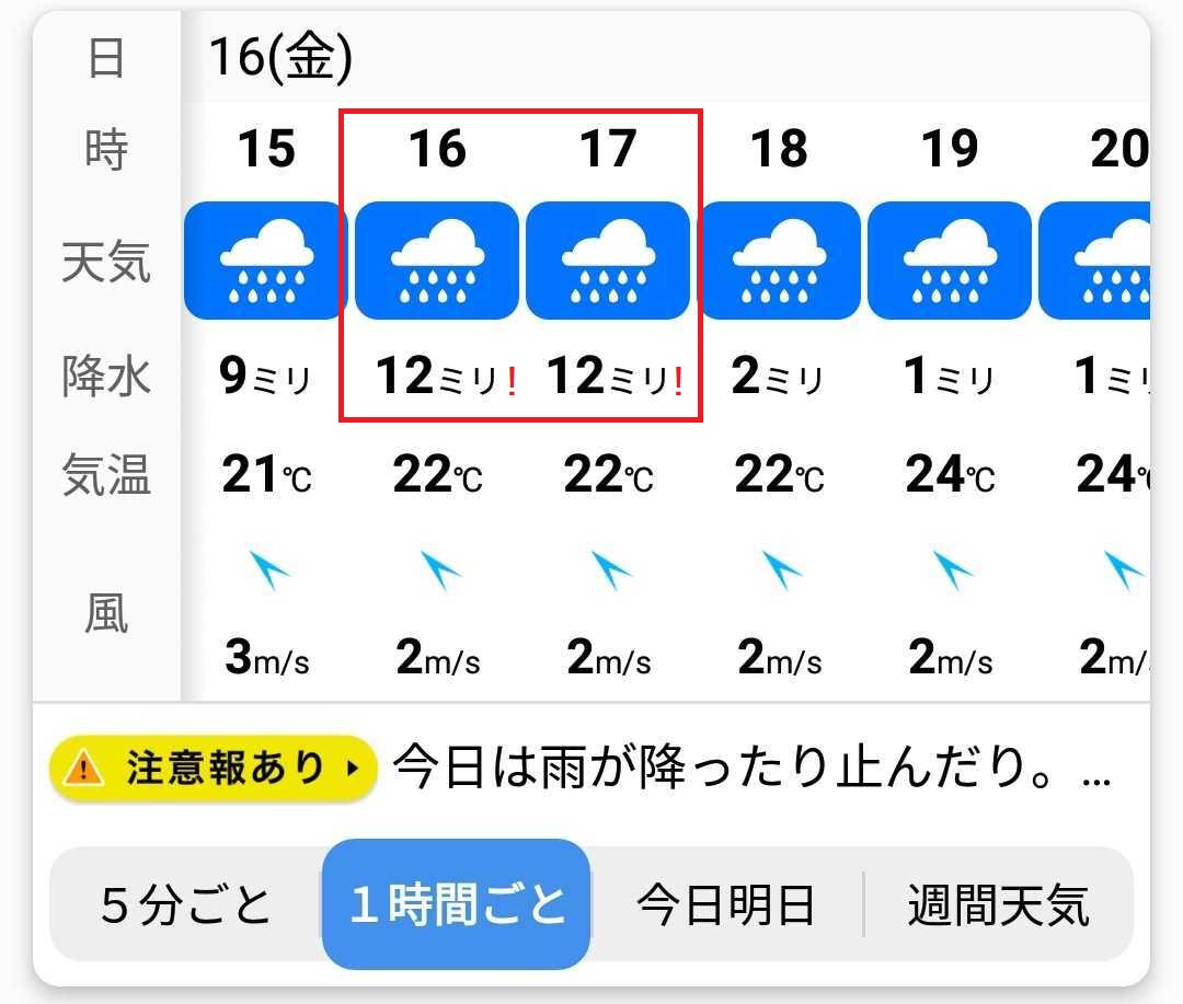 大雨予報だったので、中止の決断をしたのですが…(16時頃の天気予報はこうだったのに↓)ちょうど17時過ぎに再び雨が止み、草とりするつもりで来てくれた方がいたので、結局、実施しちゃいました!